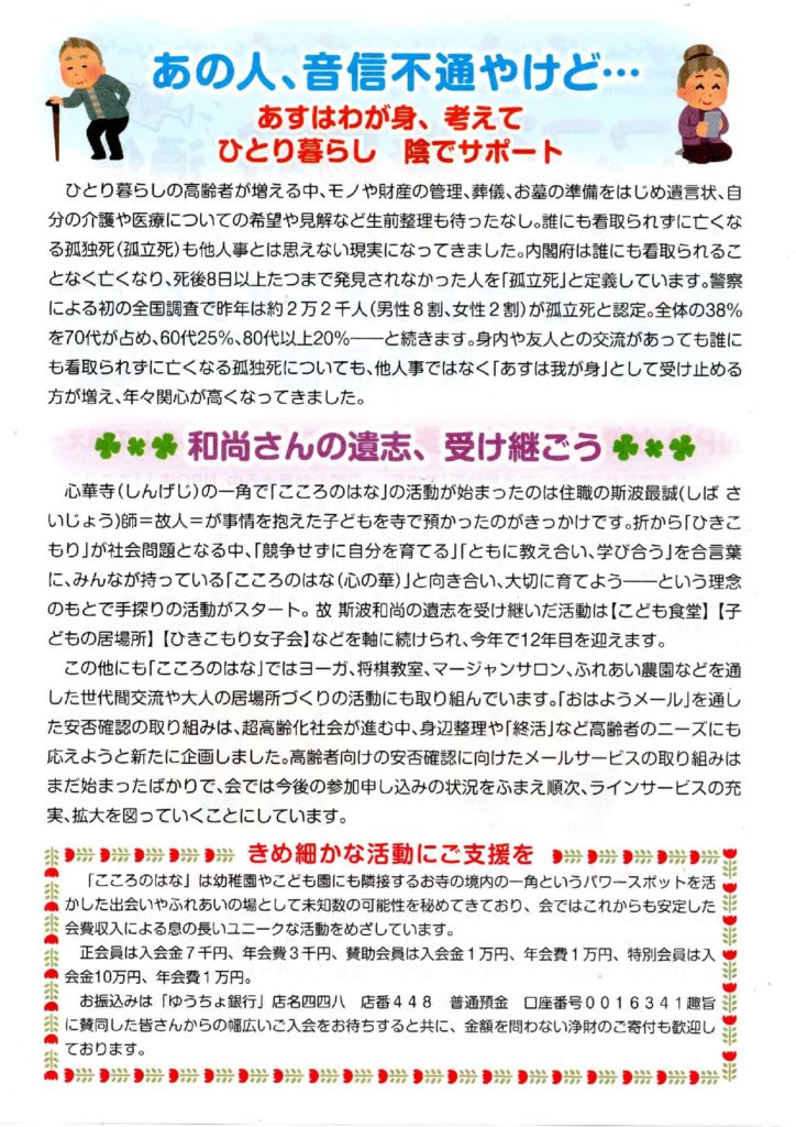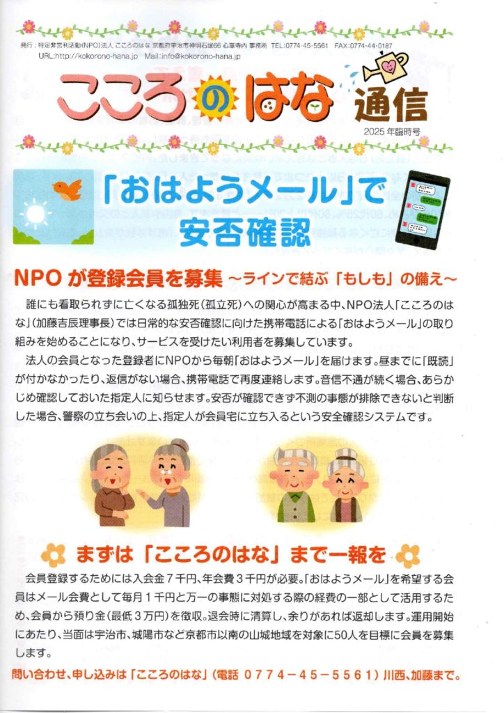 2025.08.30 2025.11.6 おはようメール始めました おはようメール おはようメール 会員募集中 宇治市、城陽市、久御山町等山城地域、京都市の方を当面対象としています。 詳しくはお電話で! こころのはな通信 2025年臨時号 ひきこもり支援 宇治市を拠点に活動しています。 前の記事 子ども食堂 次の記事